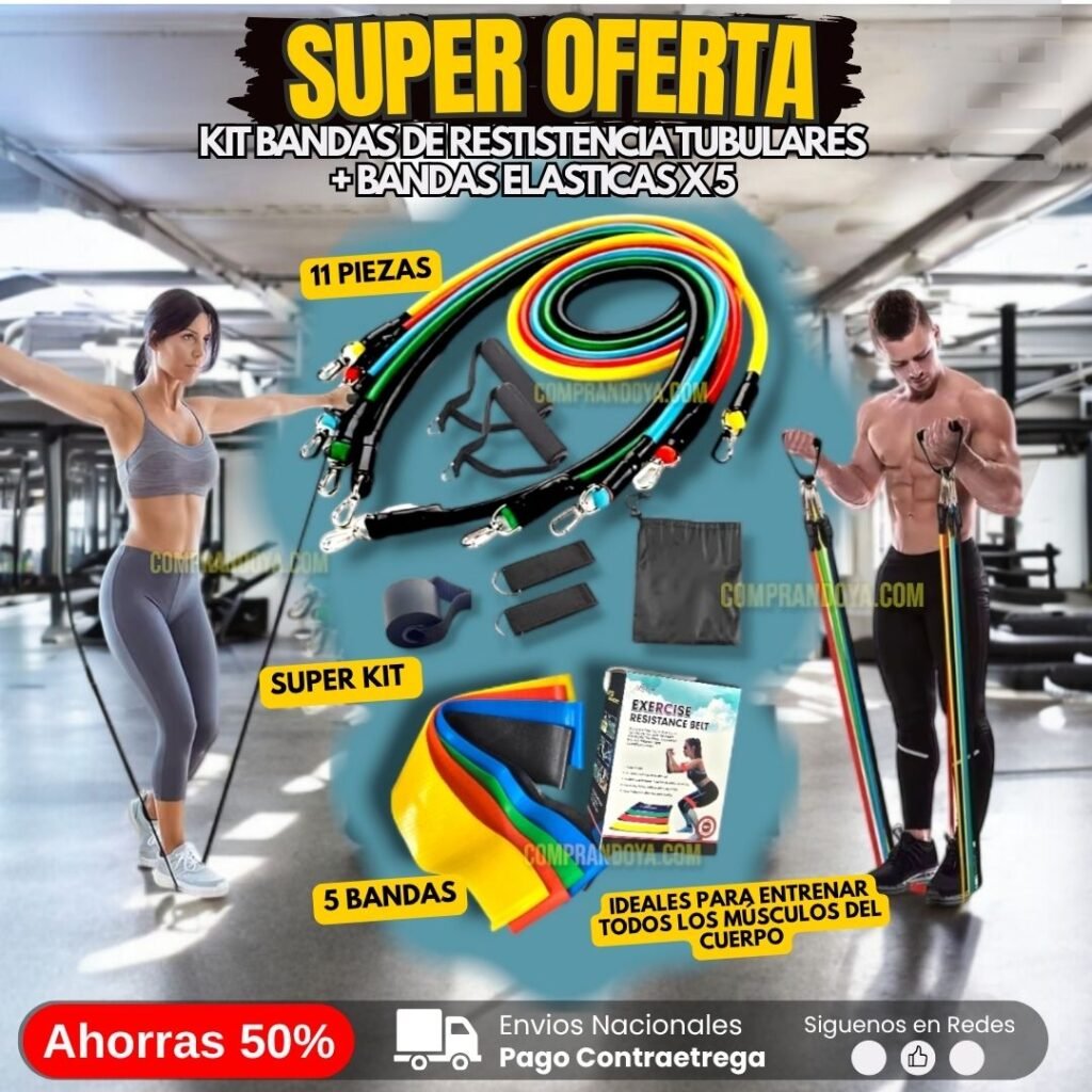 Super Kit Bandas De Resistencia 11 Piezas + Bandas Elasticas X5
