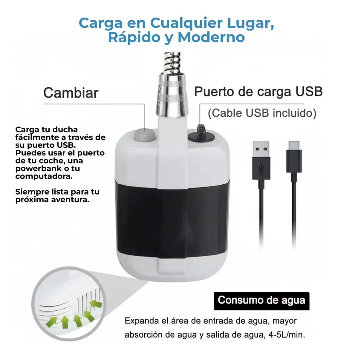 Esta ducha portátil está diseñada para brindarte comodidad en cualquier entorno. Su batería recargable por USB permite usarla sin necesidad de conexión eléctrica directa, lo que la hace perfecta para camping, paseos en carro, viajes en carretera o actividades deportivas.